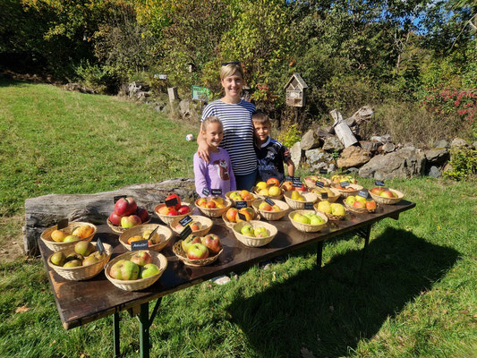 Doppelte Bellefleur, der Riesenboiken, der Apfel von Croncels, der Ontario, der Pom d‘Or und Signe Tillisch. Auch der Donsbacher Streifling durfte nicht fehlen. Interessant sind die Unterschiede
